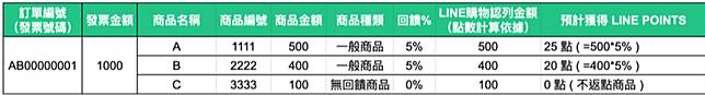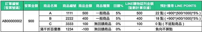 LINE購物認列金額:為 {發票金額} 扣除 {無回饋商品金額} = LINE購物認列金額(點數計算依據)。