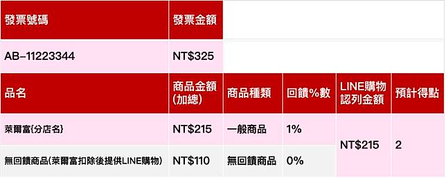 LINE購物認列金額:為 {發票金額} 扣除 {無回饋商品金額} = LINE購物認列金額(點數計算依據)。