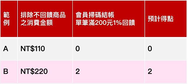 訂單範例:如用戶於萊爾富實體門市購買A、B、C三個商品,一般商品A、B消費金額分別為NT$90、NT$125,無回饋商品C消費金額NT$110 (萊爾富收銀系統會將商品金額加總,扣除無回饋商品金額後,回傳LINE購物);若後續無退換貨,LINE購物將依據一般商品加總金額進行發點計算,有回饋的商品會依照 LINE購物認列金額乘以回饋1%無條件捨去後,共2點進行點數發送。