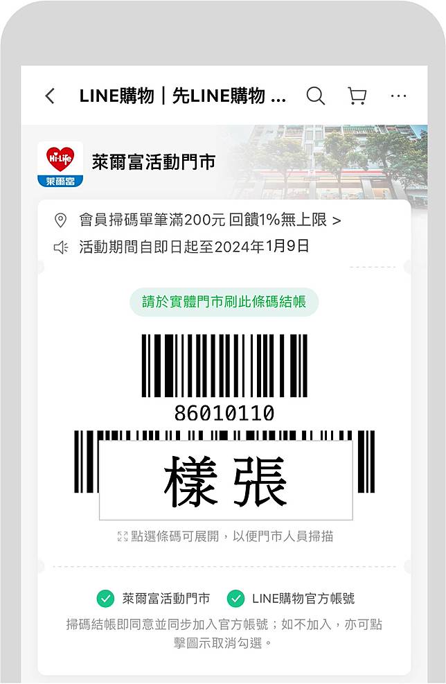 活動期間至萊爾富全台活動門市,萊爾富會員消費出示「LINE購物條碼」掃碼結帳 單筆滿新台幣200元(點我開啟條碼),享LINE POINTS 1%回饋 (符合回饋條件之商品單筆消費滿200元始有回饋,小數點無條件捨去,單筆199元以下無回饋) 回饋無上限。