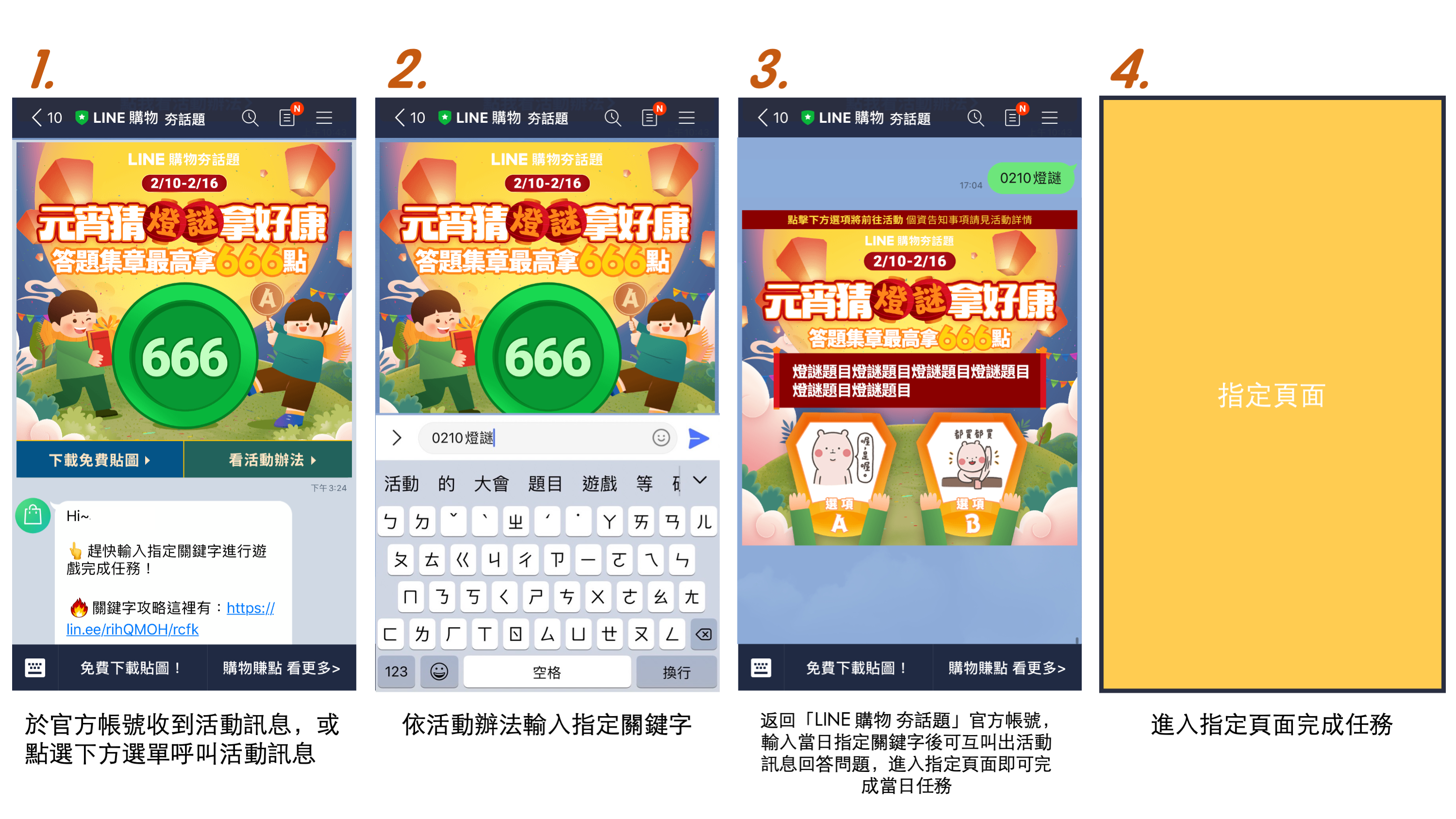 A. 於活動期間內,輸入當日對應之指定關鍵字(請參考下方關鍵字列表)以呼叫當日活動題目訊息,回答問題並前往指定頁面完成任務(此頁面可能為LINE購物頁面或LINE購物合作廠商之頁面),即可獲得1個章。