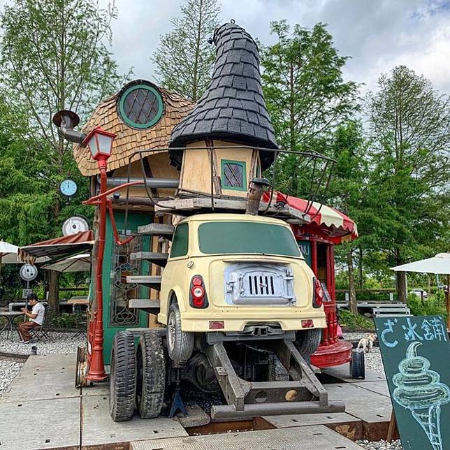 看完感動人心的小白屋,接下來是可愛的城堡,充滿童趣及幻想的造型,根本就像來到電影場景阿!難怪吸引大批人潮上門拍照打卡!現在咖啡館旁邊,又悄悄出現一座「霍爾的移動城堡」,以復古卡車、城堡以及樹枝等,各種元素所打造出的冰舖城堡,造型奇特繽紛,也太適合拍照了吧!旁邊還落雨松以及湖泊,秋冬就來這裡拍照打卡。