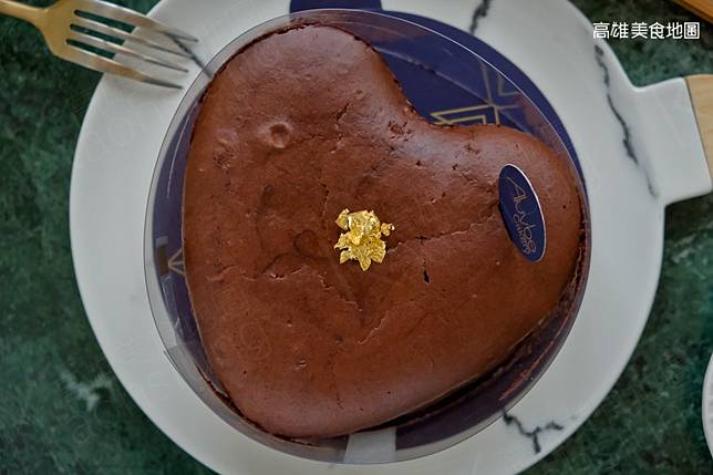 偏濕潤的蛋糕體中充滿濃厚苦甜巧克力風味,正是古典巧克力蛋糕的特色。這一款黑心巧克力蛋糕,使用法芙娜單一產地的巧克力,可可含量高達72%,吃一口,很像直接在吃口感較為柔軟濕潤的巧克力。蛋糕上面並放了食用金箔,在清一色的深可可色中,點綴一抹亮眼奢華。