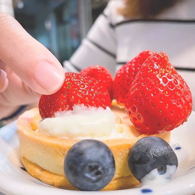 上頭擺滿的大湖草莓,直接沾著特製的卡士達醬,甜而不膩吃起來超幸福!單吃沾滿卡士達醬的特製塔皮,又是另一種風味感,就是一款甜點可三吃的概念啊!