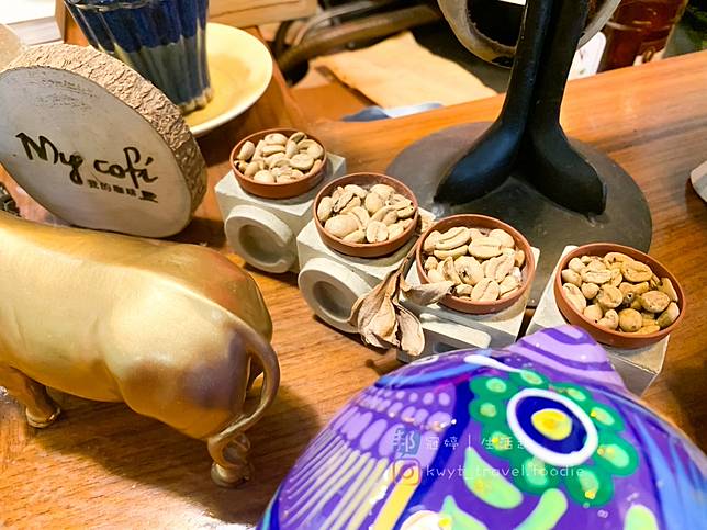 從咖啡生豆中挑選出來的瑕疵豆,完全沒有浪費,使用在My cofi店內大大小小的裝飾中,讓空間裡的小地方充滿著咖啡元素。