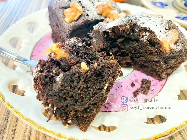 剖開布朗尼的中間,看的到布朗尼的質地是蠻濕潤的,沒有太乾不好入口的問題,且發現有不少的核桃顆粒藏身於其中。