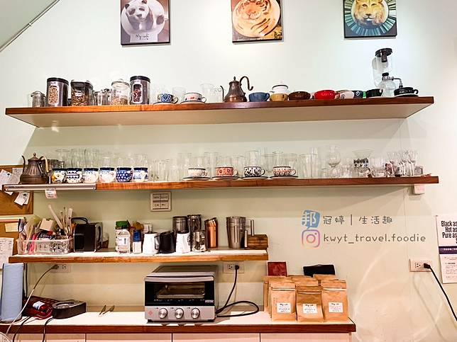 中等坪數約莫25坪的空間裡,吧台區的部分占比相當中,咖啡廳的核心都在這裡,闆闆精心收藏、細心珍藏著的精緻咖啡杯、沖煮咖啡的各式咖啡用具、商業型義式咖啡機、製作餐點等通通濃縮在這裡。