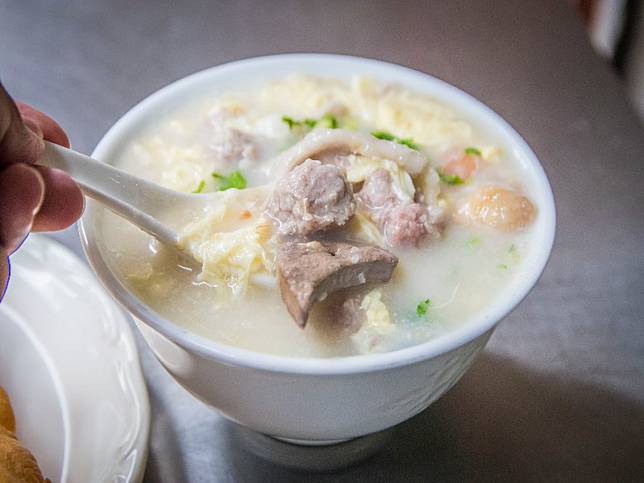 與其說是吃粥不如說是喝粥,如同濃湯一般的口感讓人沉醉,加入的胡椒及香料不會嗆鼻,反而溫潤無比,滑嫩的蛋花配著軟Q的肉丸、鮮甜的豬肝,吃下去時候的美味感,如同吃下數道宴席料理般,再將剛剛香脆的老油條泡入粥中,吸飽湯汁的微軟口感,和單獨吃的香脆口感各有風味。粥裡的配料都十分入味,不會因為是粥類而過於清淡,份量十足的配料也會讓人吃個過癮,是很有飽足感的一道小吃。