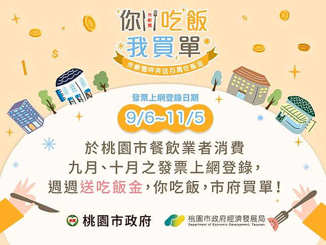 然而危機即是轉機,因應疫情調整商業模式為現今趨勢,為促進、鼓勵桃園市餐飲業者數位轉型、擴增網路銷售通路及行銷能量,桃園市政府經濟發展局推出「你吃飯‧我買單」送百外吃飯金活動。民眾只需要憑在桃園市內餐飲消費的發票,登錄官網後就有機會獲得該張發票的「吃飯金」,盼能帶動因新型冠狀病毒病疫情而收到衝擊的消費經濟。在疫情趨緩之時協助商圈經濟復甦,同時發展特色活動吸引民眾在疫情之後前往桃園觀光,體驗當地特色文化、欣賞歷史建築、購買旅遊商品,打造區域亮點,帶動區域經濟振興。