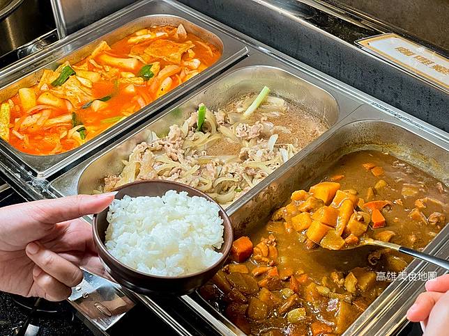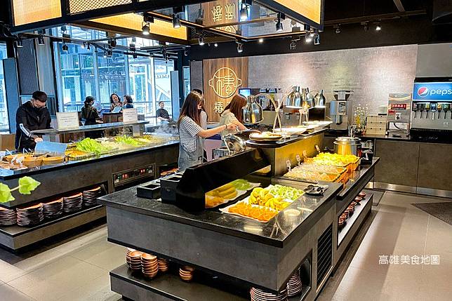 除了肉品主菜,其他的N種配菜都可以在充滿誘惑的自助吧台區找到,從魚蝦、蔬菜、年糕、牛丼、麻辣鴨血豆腐、炸物、水果飲料、冰沙冰淇淋,不只選擇多,整個自助吧餐區也整得極美,現代感十足,寬敞通道取餐也舒服。