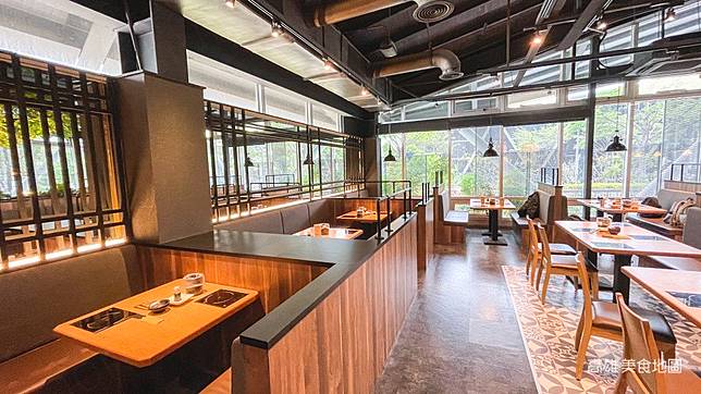 彷彿與中都濕地公園融為一體的綠建築,自帶專屬地下停車場,在樹林環繞包圍的餐廳裡,也有著滿眼綠意,大量的木桌椅與隔間,些許黑色工業風元素妝點,是個能讓人很舒壓、很放鬆的用餐空間。