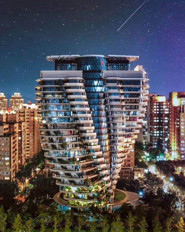 「陶朱隱園」順時針4.5度向上旋轉的藝術外觀,曾獲得美國CNN評選為2016全球九大城市地標之一,並且是唯一入選的住宅建築,更是全台首座垂直天際的綠建築,每戶都有不受樓板遮蔽的大面積露台,因此戶戶都能種樹,號稱會「吸碳」的森林建築。
