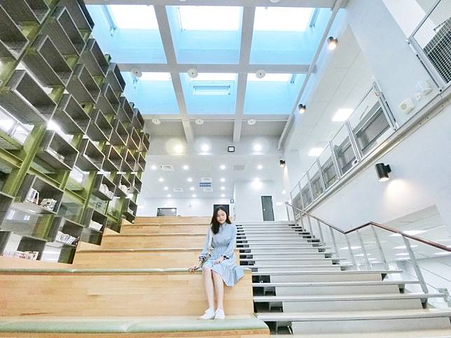 鹽埕圖書館外觀以書本的堆疊形式象徵知識的結晶體,呼應圖書館及鹽埕地方特色;館內還有高達三層樓的大階梯和書牆,屋頂是透明的格狀玻璃,採光十分良好,找個喜歡的位子坐下,翻閱著手裡的書本,為自己提升了幾分知性氣質。