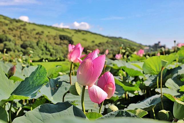 在淡水的石頭厝屯山社區,也能欣賞到美麗的荷花喔!近年來淡水石頭厝每到夏季就成為許多人必去的賞花景點,約有十幾公頃的荷花田,在荷花盛開之際,來到靠近大屯山的石頭厝就可以看到滿池盛開的荷花,在青山綠水之間還能聞到陣陣花香,非常有田園之樂。