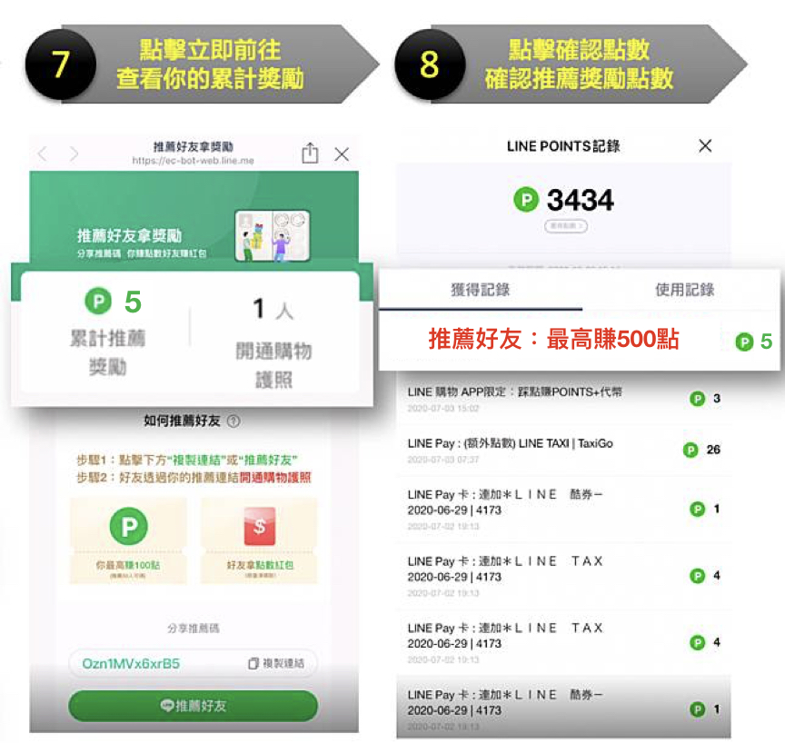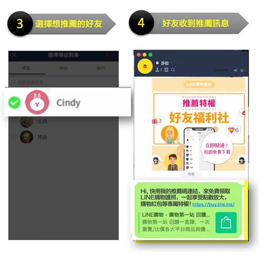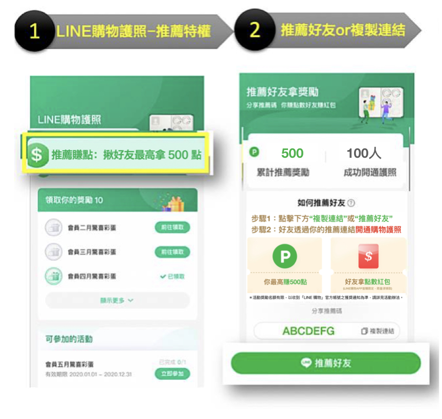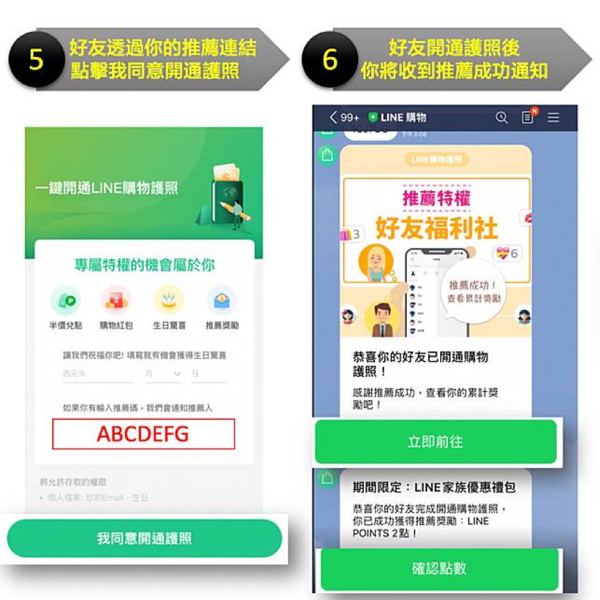 活動期間內,在開通LINE購物護照後,於活動頁推薦親朋好友前往開通護照。當好友成功開通護照時,推薦者及被推薦者皆可獲得獎勵。