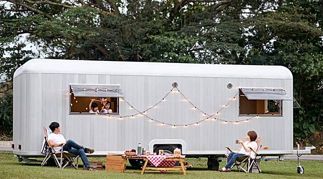 看似不大的露營車,提供兩種「房型」可選擇,包括可以打地鋪的日式和室,也有使用一般床組的房間;住宿提供管家親送的早餐和野營晚餐,還能使用飯店內的溫泉、游泳池、健身房,可以說是戶外露營與飯店服務兼得的一種選擇。