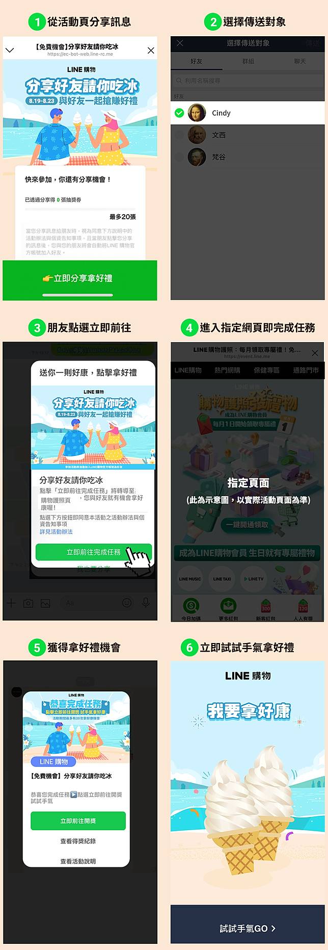 例如:您推薦並邀請好友點選您分享的連結,並由您的好友以登入中的LINE帳號進入指定頁,成功後您及您的好友將會收到「LINE購物」官方帳號通知獲得好禮。