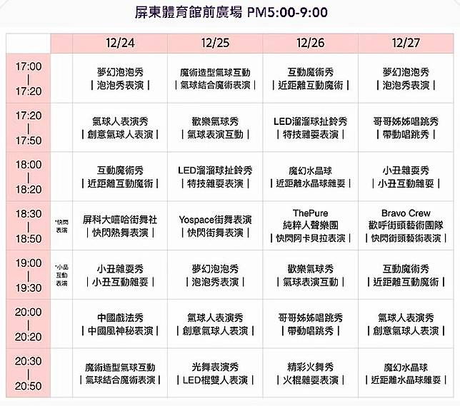 而除了浪漫的燈飾外,主辦單位於12月每週末及12月24日至27日期間,舉辦了一連串的音樂演出、魔術秀、屏東下雪了及親子互動等精彩活動,喜愛逛市集的民眾也別錯過充滿異國風情的聖誕市集喔!