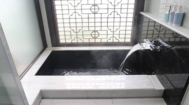 ▲就連浴池邊的窗戶同樣是中式窗框(圖/鹿咖啡旅宿)