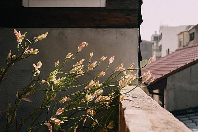 ▲不知名的花葉,沿著牆垣向外伸展著(圖/老古石渡)