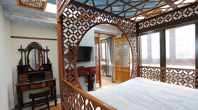 而在旅宿方面同樣有著中式建築的古典高雅,以紅木傢具搭配房間,走進房間瞬間竟有種步入宮廷劇中的感覺。