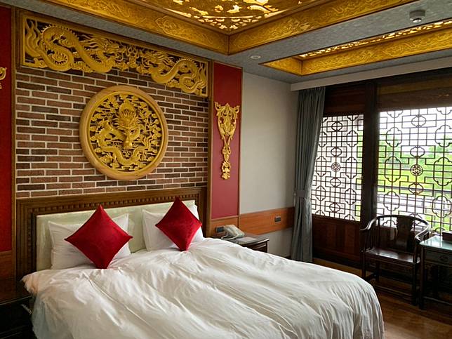床頭的龍形紋飾,貴氣十足,優雅的四柱大床,讓人感覺無比尊榮。如此的中式古典風搭配窗外的庭園景緻,優雅寧靜,冬山河就在窗前,為美好的旅程留下美好的回憶。