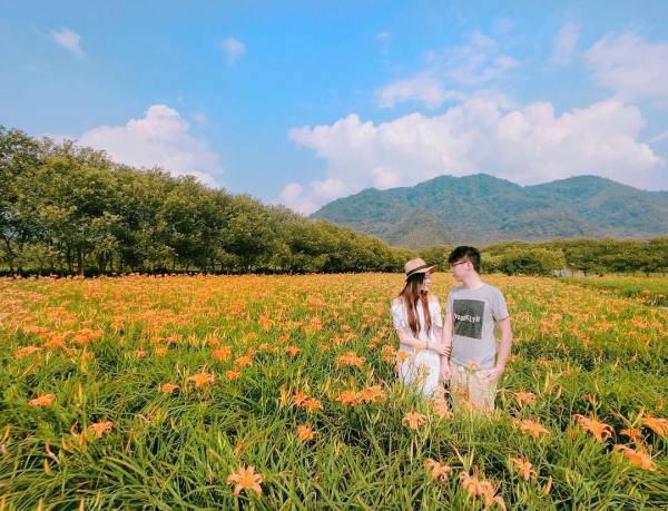 日月潭頭社金針花海是台灣唯一的水田金針花,金針花海大約在每年母親節前後至八月間綻放,一大片金橘色的金針花以優美的姿態站著,拍起來和畫面中的藍天白雲特別和諧,