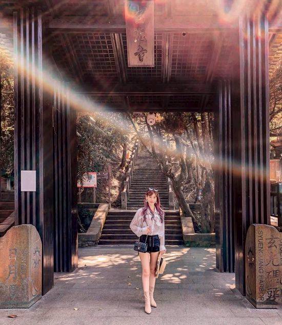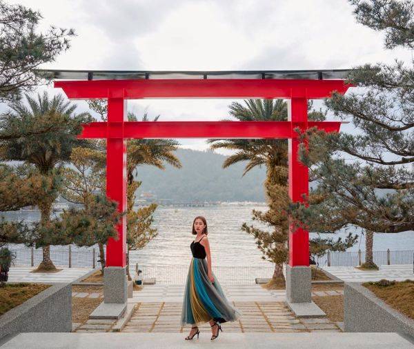 再往日月潭纜車的方向走一點,日月潭纜車站前的日系紅色鳥居搭配南洋風味的椰棗樹,加上身後的湖畔景色,瀰漫著另一種美。