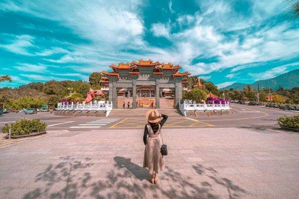 日月潭文武廟是全台第一個於廟中供奉孔子神像的文武廟,也是台灣最高的文武廟,屋頂採用非常罕見的重檐廡殿式,是宮殿式建築的最高等級,金黃色的中國風建築搭配日月潭的碧湖藍天,從後殿的觀景台上望去氣宇非凡。