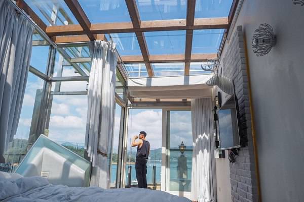 水岸休閒飯店最受歡迎的莫過於玻璃屋房型,以白色為主色調,再運用材質的差異性來創造視覺層次,簡單乾淨的白卻不乏驚喜與變化,讓空間更細膩更耐看,天花板採用玻璃元素,保留天景結合電動布幔,拉進空間與自然的距離,