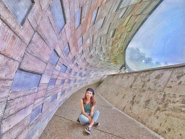 身為全台唯一墓園露營區,櫻花陵園能夠俯瞰整個蘭陽平原和太平洋,天氣好時海可以遠眺龜山島,而其中最讓櫻花陵園聲名大噪的就是它入口處的「櫻花橋」,流線型、傾斜的牆面設計,讓人置身其中彷彿能穿越時空。