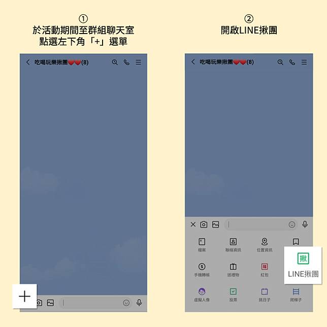 打開群組「+」選單->點選LINE揪團->選擇想要查看的揪團活動