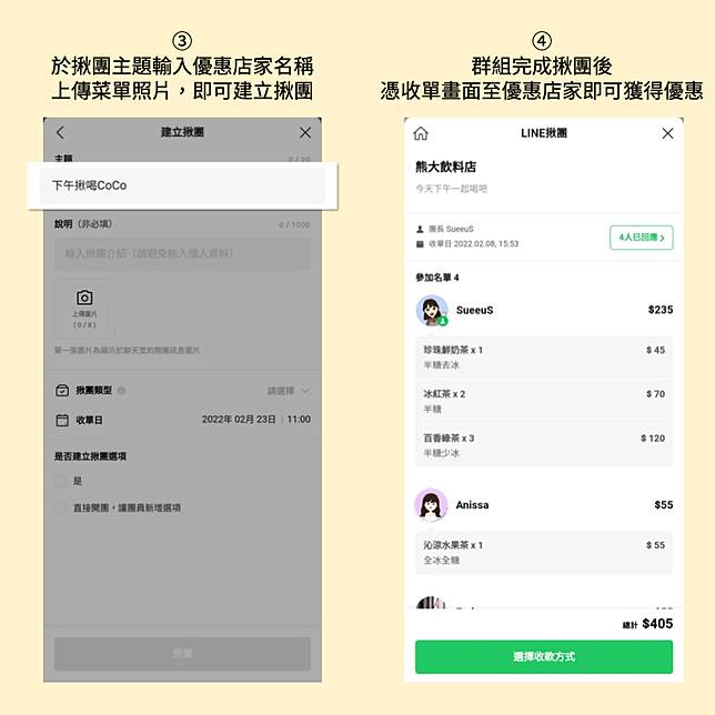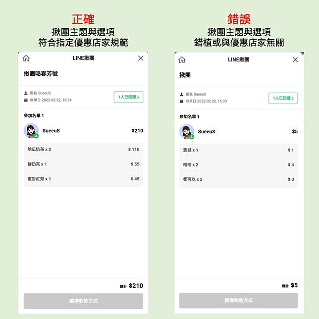 2. 揪團主題需涵蓋優惠店家名稱,選項需輸入該店家有販售之品項,如不合規範則無法獲得優惠。