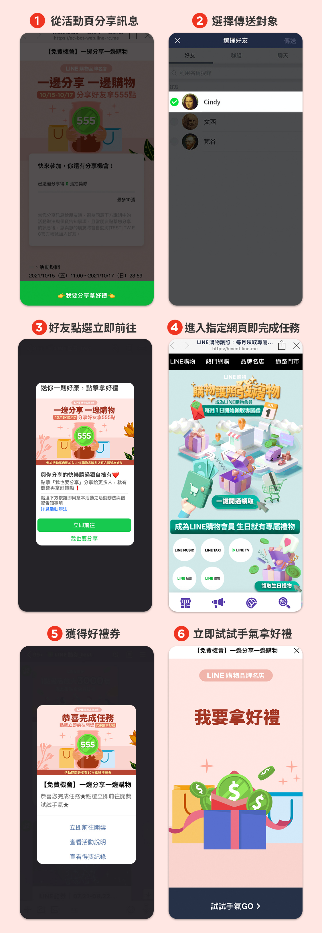 例如:您推薦並邀請好友點選您分享的連結,並由您的好友以登入中的LINE帳號進入指定活動頁,成功後您及您的好友將會收到「LINE購物品牌名店」官方帳號通知獲得好禮。
