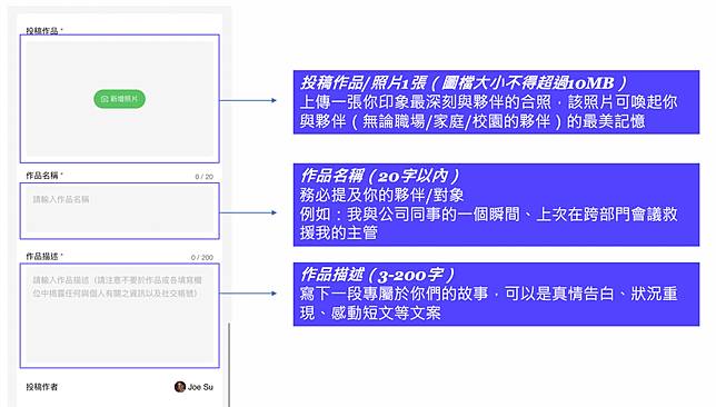 1. 投稿內容必須為自己與夥伴相關的照片及文字(請留意:上傳照片內容如包含他人肖像等內容或權利,投稿者請確認已獲得當事人之同意及所有相關權利),上傳的照片檔案大小不得超過10MB。