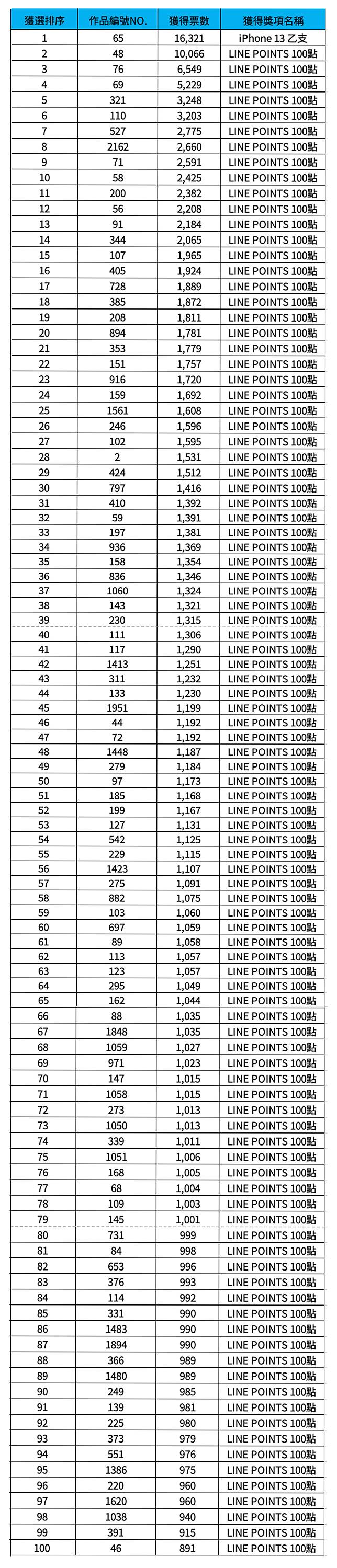 活動結束時,依照活動頁顯示的即時票數與排名,決定人氣獎名次,每位投稿者(即單一LINE帳號)只能獲得1次獎項,若有同一帳號重複排名於前100名內,將由次1名往前遞補,以此類推。獎項將於2022年8月29日起陸續發送。