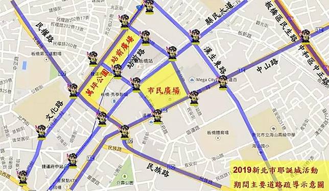 ▼新北歡樂耶誕城活動期間管制路線,2019年新北歡樂耶誕城交管區域示意圖