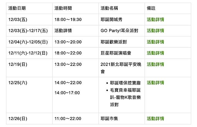 去年的新北歡樂耶誕城,三大活動區域中的「市民廣場」,耶誕活動期間有許多精彩演出,看看底下的節目表,每一項都令人期待!從活動首日揭開序幕的超震撼氣勢「耶誕開城秀」,到每年必逛、好拍又好玩的耶誕市集、還有大小朋友都期待的耶誕歡樂派對,及粉絲絕對不容錯過的耶誕演唱會,這長達一個月的舞台活動,絕對讓大家在12月不無聊唷!