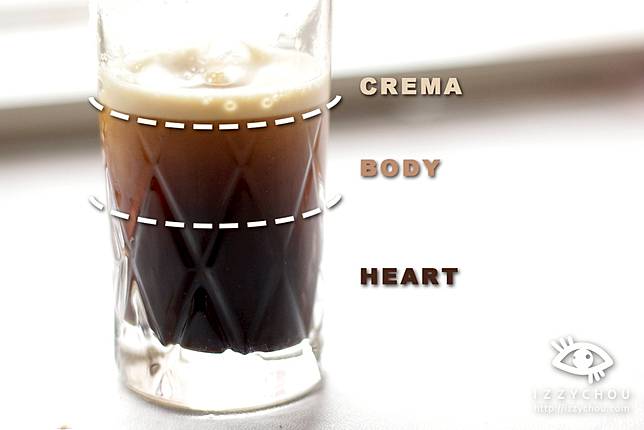 給大家看看nanopresso萃取出來的咖啡,真。的。是義式濃縮, crema(最上層的油脂微粒,咖啡的香氣所在)、body(咖啡入口後厚重、濃稠的厚實度)、heart(咖啡的苦味)一個都沒少啊~~~~~
