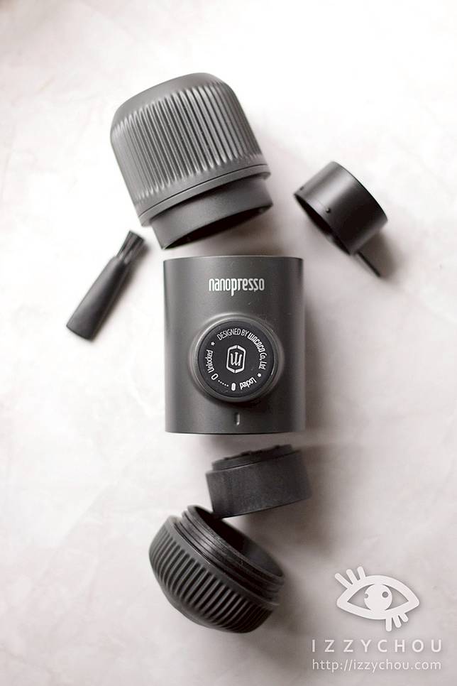 nanopresso的構造跟零件都很簡單,由上而下包含:注水杯、濾杯本體、咖啡粉填充杯、密封蓋,以及一個用來裝填/壓平咖啡粉的咖啡匙(右)跟清潔刷(左)。