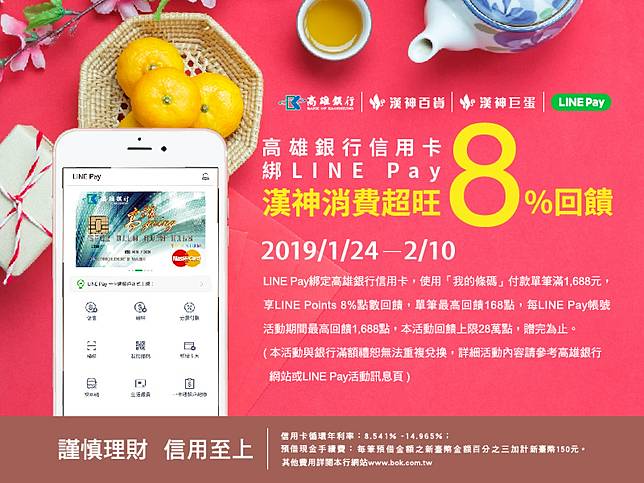 2. 活動期間2019/1/24(四)至2019/2/10(日),透過LINE Pay「我的條碼」選擇已綁定高雄銀行信用卡於漢神百貨及漢神巨蛋付款,單筆消費滿1,688元以上(LINE Points點數折抵金額不計入),可享LINE Points 8%點數回饋。以每筆實際卡片支付金額x8%後四捨五入計算,每LINE Pay帳號單筆交易最高限得168點,每LINE Pay帳號於活動期間累計最高限得1,688點,漢神百貨、漢神巨蛋兩館消費回饋合併計算。活動期間所有LINE Pay帳號總回饋上限28萬點, 送完為止,額滿訊息將透過LINE Pay官方帳號通知,請務必加入LINE Pay官方帳號並解除封鎖。