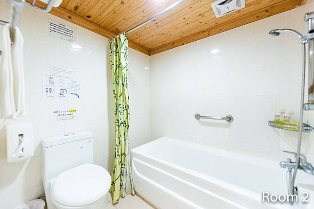 浴室以白色為主色調,天花板採用木製材質,營造出舒適的鄉村風格。舒適的浴缸讓旅客回房後可以舒適的泡個澡,洗去一整天的疲勞。