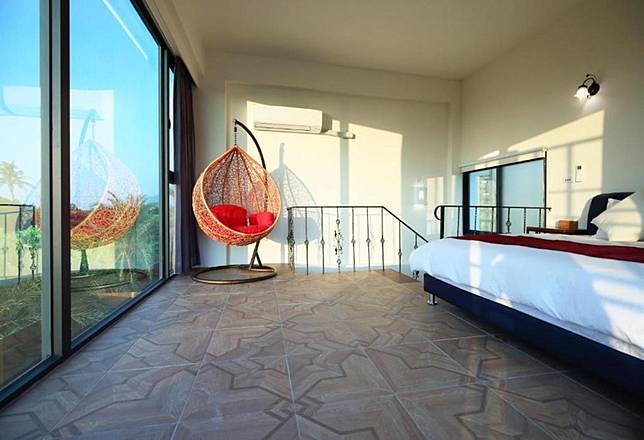 樓中樓內設有吊椅,可以盡情放空享受寧靜,加上距離海邊很近,大片落地窗則可在房間一覧無遺,佈置有設計感也令人放鬆。