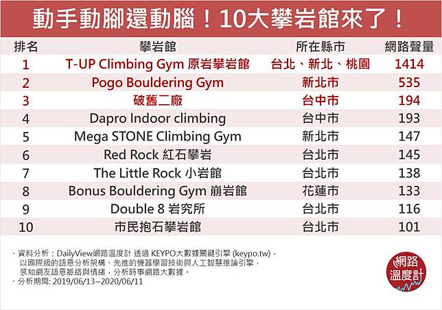 不少運動都講求力量,但有些運動就算空有一身蠻力也不一定比較厲害,而攀岩正屬於這類講求力量與技巧結合的運動。一般來說攀岩又分為抱石與上攀,前者不需要確保,高度較低,多用來練習動作與技巧;後者因為高度較高,需要裝備與夥伴確保,多為垂直上攀為主。今天的DailyView網路溫度計就要透過《KEYPO大數據關鍵引擎》,告訴你全台有哪幾間網友經常提到的攀岩館。如果不知道從何下手,或是想要體驗不同場館的路線,下次不妨就從中挑選吧!