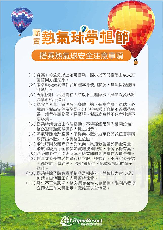 收費方式:入場清潔費100元/人、熱氣球繫留升空體驗600元/人