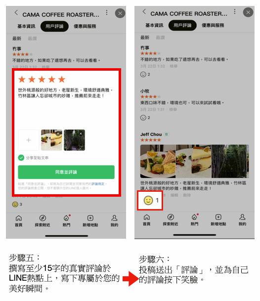5. 活動期間用戶能夠於LINE熱點服務的所有店家詳情頁留下評論以參與活動。