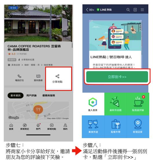現在只要評論分享你最喜歡的咖啡廳,將自身體驗搭配精美的圖片留下評論在LINE熱點上,即可獲得刮刮卡乙張!