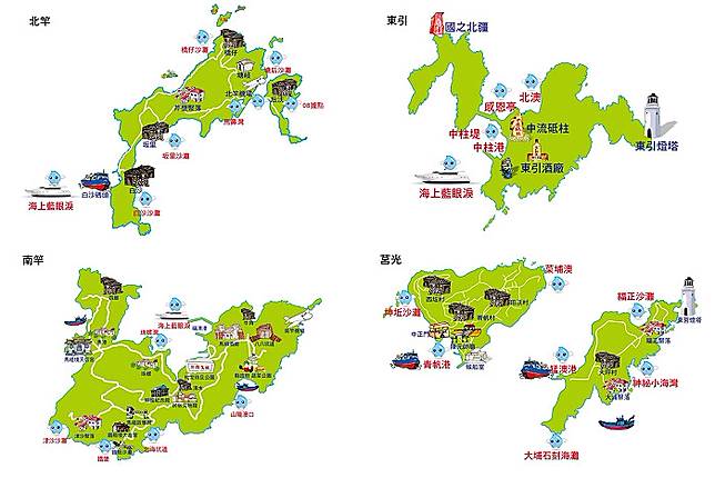 東莒:福正沙灘、燈塔(青山嶼)、大埔石刻、大埔村、神秘小海灣、猛澳碼頭。