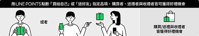 活動期間使用LINE POINTS 1點「買給自己」、「送好友」或「進行群組送禮」活動指定商品,即可獲得1次好禮機會,單一LINE帳號限「購買/贈送」共10次。