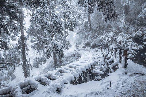 蒼鬱的古道非常適合夏日避暑、冬季賞雪,日治時期這條路曾是運送木材的必經之路,漫步在小路間仍可看到古老的運材軌道。